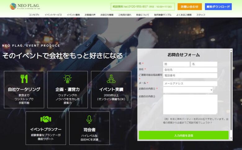 株式会社NEO FLAG.は、ウェディング事業で培ってきた企画提案力を活かし、社内イベントに特化してプロデュースをおこなっている会社です。交流がメインとなる結婚式の企画・運営経験が豊富にあるため、社内交流会の企画・運営においてもコミュニケーションが活性化されるイベントを実現してもらえます。特に、ケータリングなどをともなうパーティー形式のイベントが得意です。