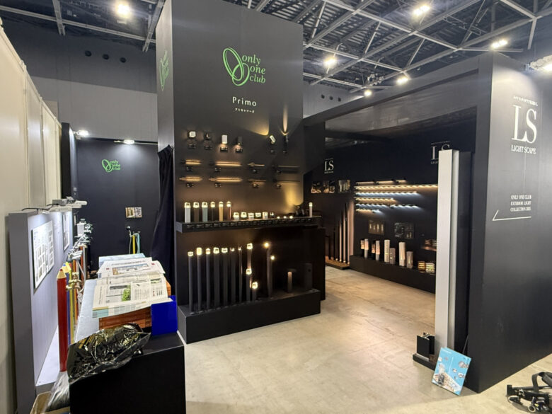 全体をブラックで統一することで「暗めのブース」を作り、照明器具そのものを際立たせているのが特徴です。黒は「高級感」「モダンさ」を象徴するカラーであり、来場者に落ち着いたプロフェッショナルな印象を与えています。