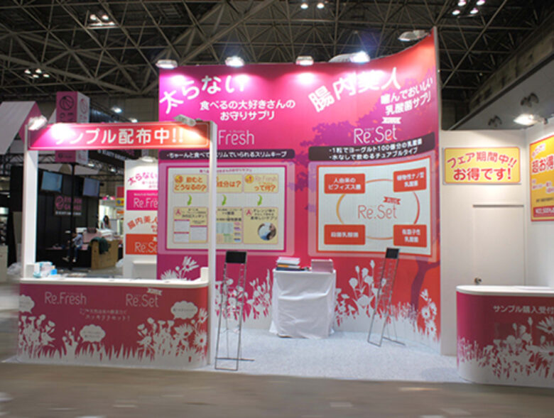 同ブースでは、全体をブランドカラーのピンクで包み込み、サプリメントの「健康的・華やか・ポジティブ」なイメージを直感的に訴求。壁とカウンターを同じ色調で揃えることで統一感が生まれ、来場者の記憶に残る鮮やかなデザインになっています。