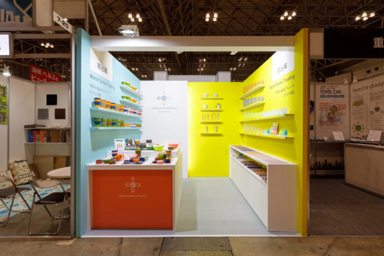 シリコン製品の制作を手がける「World Smile Trading合同会社」のブース事例です。ブースは「1小間」で設計されており、おしゃれなポイントとして次が挙げられます。