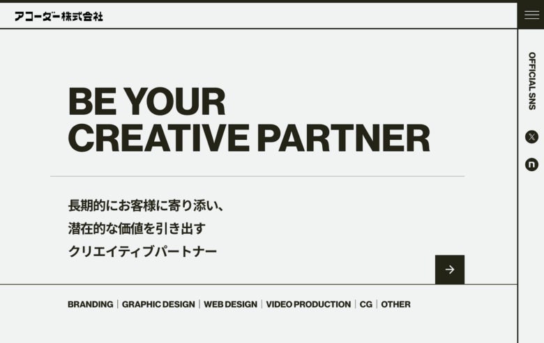 壁面のテキストやグラフィックは整理されており、余白をしっかり確保しています。必要な情報を最小限に絞ることで「洗練された映像制作会社」という印象を強調し、詳細な説明は会話や資料で補完できる設計になっているのが特徴です。