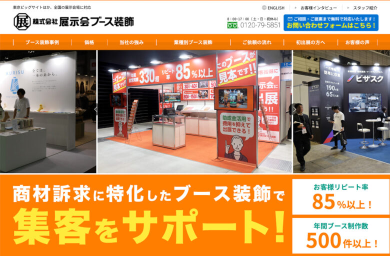1小間18万円からの施工実績があり、予算に合わせた柔軟な提案をしてくれる点も魅力です。1小間の小規模ブースから27小間規模の大型ブースまで対応可能で、幅広いスケールに応じた設計力があります。コストを抑えつつ見栄えを重視したい企業に適しています。