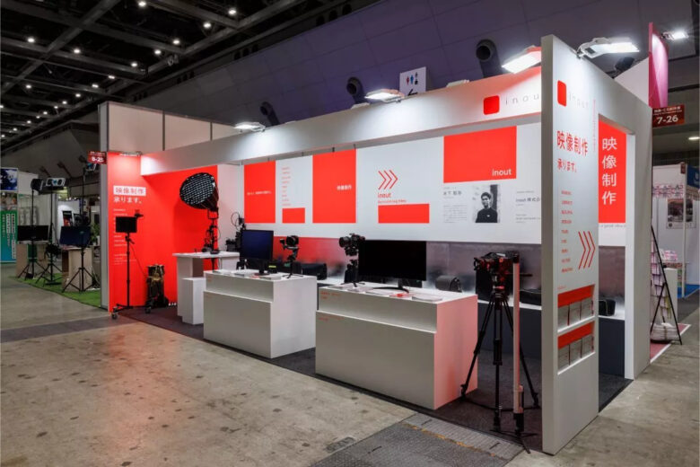 このブースでは映像制作の受注を目的としていますが、「専門家感」を出すために、あえてカメラやライトなどの機材を設置。スポットライトで赤い壁を照らすことで立体感とドラマチックな雰囲気が生まれ、来場者に「本物の撮影現場」を連想させています。
