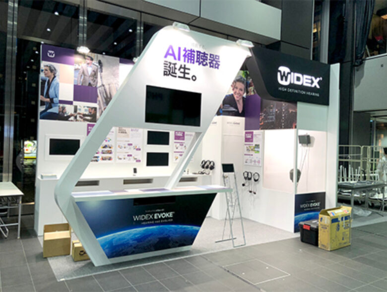 デンマークの補聴器専門メーカー「Widex」のブース事例です。ブースは「1小間」で設計されており、おしゃれなポイントとして次があげられます。
