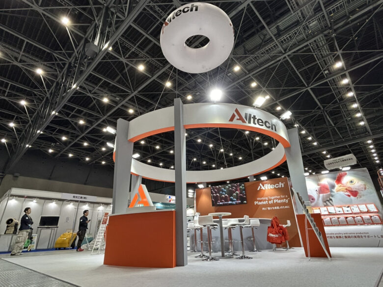 アメリカを拠点に畜産や作物農業、動物飼料などの事業を手がける「オルテック」の展示会ブース事例です。「4小間」で設計されており、おしゃれなポイントとして次があげられます。