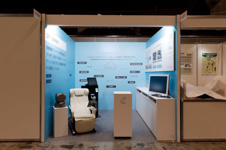 医療・ヘルスケア領域(電位治療体験ブース)の出展事例です。ブースは1小間ながら、清潔感と専門性を感じさせるおしゃれな空間演出が特徴的です。