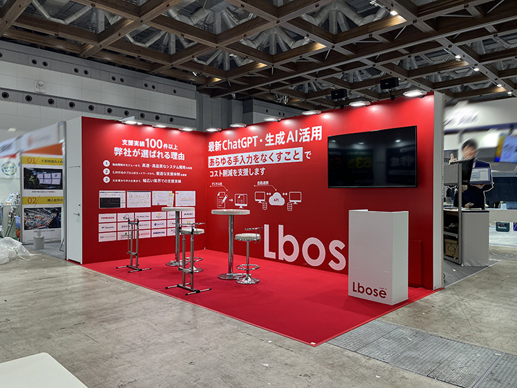 熊本県にてシステム開発やクリエイティブ制作を手がける「株式会社Lbose」のブース事例です。「2小間」で設計されており、おしゃれなポイントとして次があげられます。