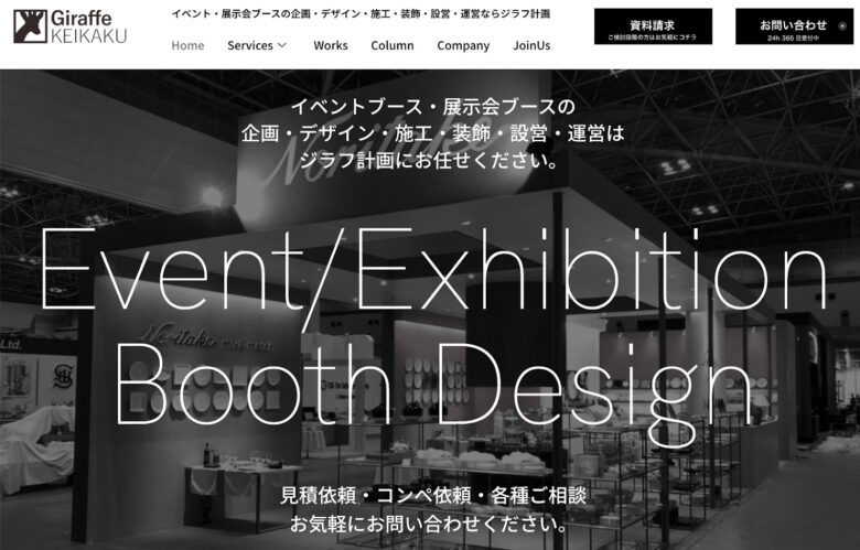 株式会社ジラフ計画は、展示会を単発イベントではなく「マーケティング施策の一部」として設計するブース装飾業者です。ブースの企画〜撤収だけでなく、出展前後のWeb施策まで含めた支援を行うため、スムーズな集客・リードの商談化を実現します。