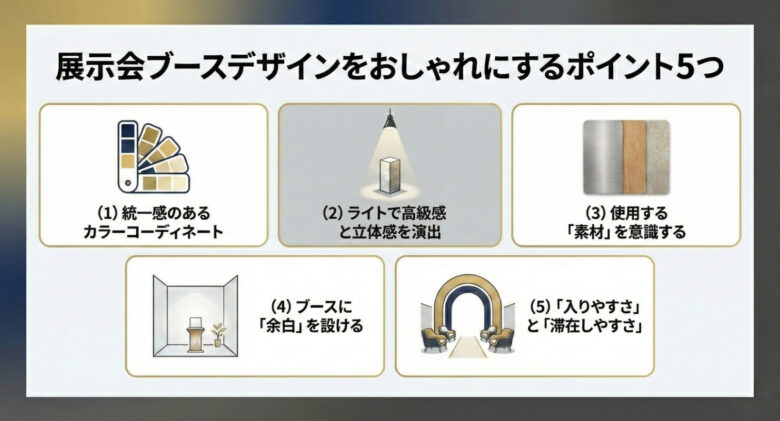 最後に、展示会ブースのデザインをおしゃれに見せるためのポイントを5つ紹介します。