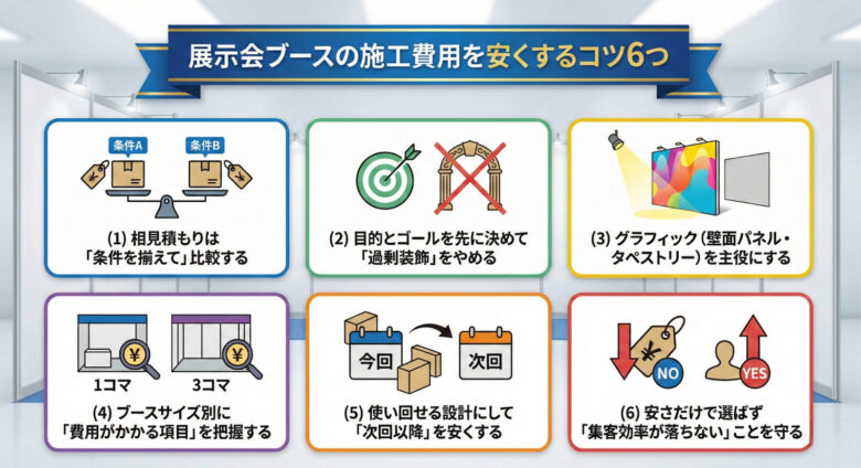 続いて、展示会ブースの施工費用を安くする6つのコツを紹介します。