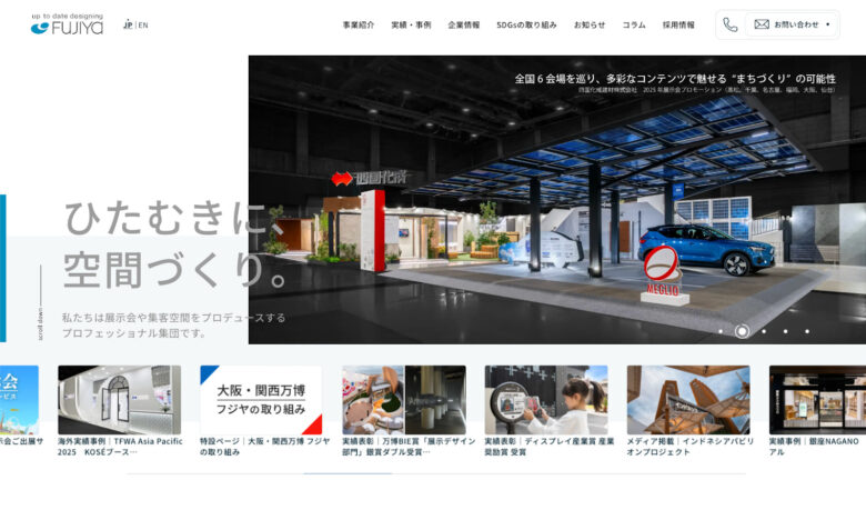 株式会社フジヤは、展示会を中心に「集客空間」をプロデュースする老舗のブース装飾業者です。展示会専門の担当者が付き、動線を踏まえたレイアウト設計や、ブランド再現に寄せたデザイン提案を打ち出してくれます。また、一級建築士事務所・建設工事業などの認可を得ているので、設計〜施工の品質・安全面を重視したい企業に相性が良いでしょう。