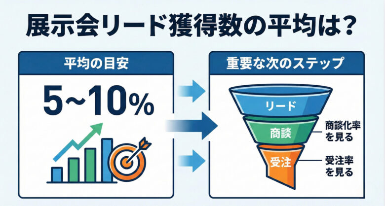展示会のリード獲得率は平均5〜10%が目安ですが、数字だけで成功は判断できません。商談化率・受注率も追いつつ、「名刺集めで終わっていないか」を確認することが重要です。