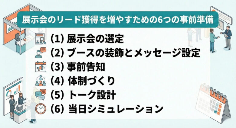 展示会のリード獲得は、当日の頑張りだけで決まるものではありません。むしろ「事前準備」こそ成果を左右するといえます。ここでは、リード獲得を増やすための6つの事前準備について解説します。