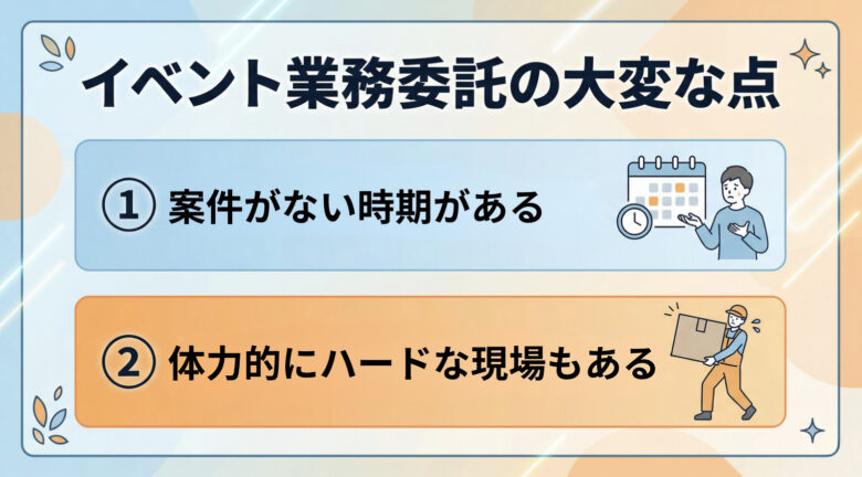 イベント業務委託は自由度が高い一方、繁閑差や長時間拘束も多いので、収入を安定させるには自己管理が必要です。